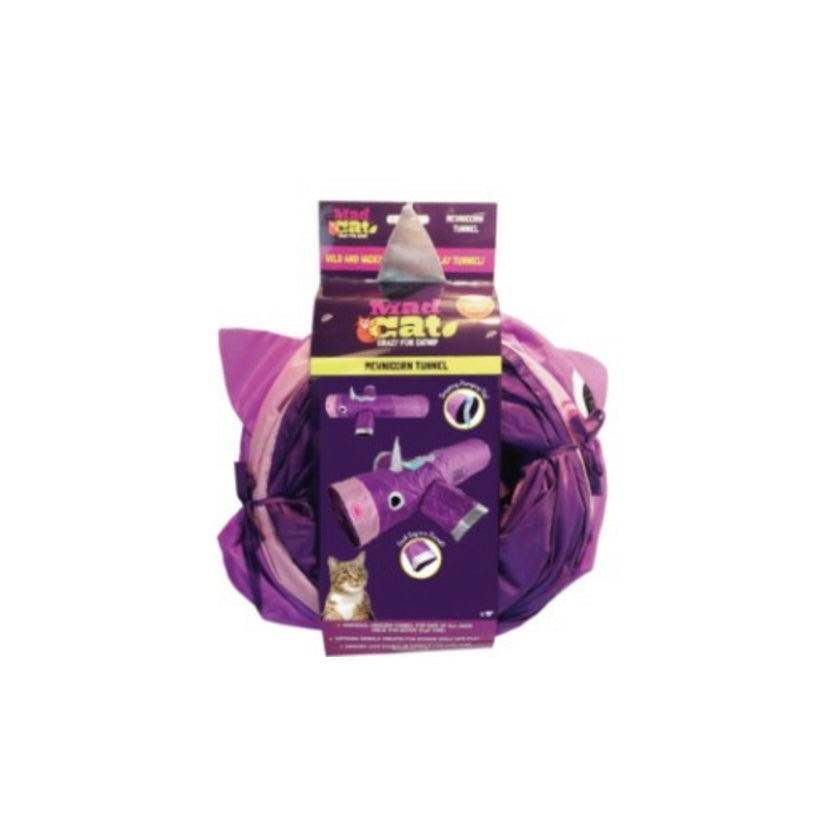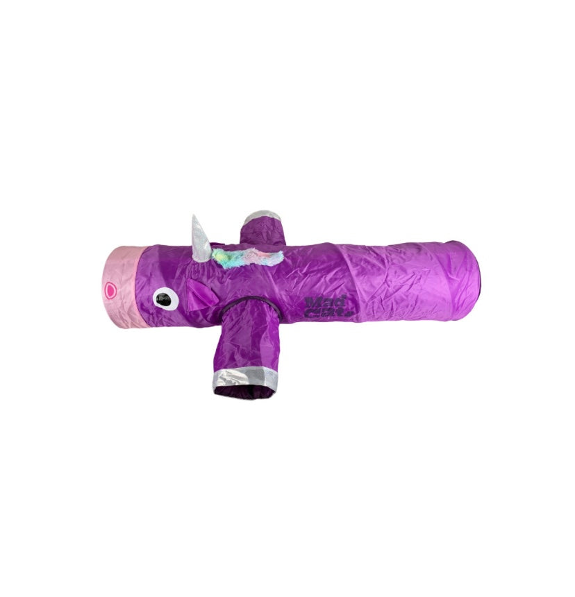 Our large and whimsical CAT 3-foot tunnel and two connected smaller tunnels are perfect for hide-and-seek and playing chase with other cats. Provides interactive fun that helps encourage daily exercise and keeps your pet active. Dangling plush tail is perfect for batting and swatting, while the enticing crinkle encourages curiosity. Folds down small in seconds and stays compact with added ties. Perfect for storage and travel. Take this cat play tunnel with you anywhere, and your pet will never feel bored. Designed to meet or exceed all applicable safety standards. Materials are non-toxic and odorless, ensuring these toys are safe for your pet.