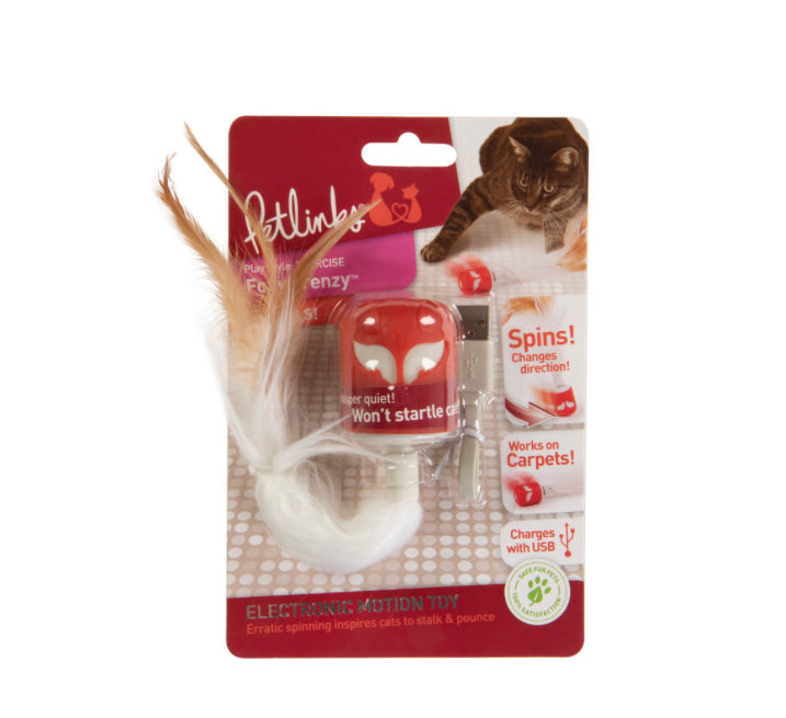 Petlinks® Foxy Frenzy™ Electronic Motion Cat Toy spins erratically to surprise and delight your cat. A long natural feather adds excitement and stimulates her hunting instincts. A USB cord is included to charge your cat's favorite spinning toy. Spins on solid surface and carpet. Made with a super quiet motor that won't startle your cat.